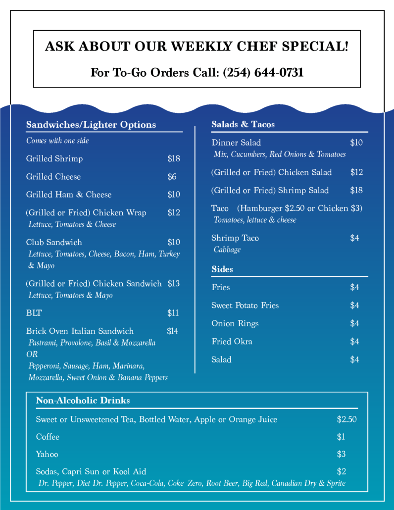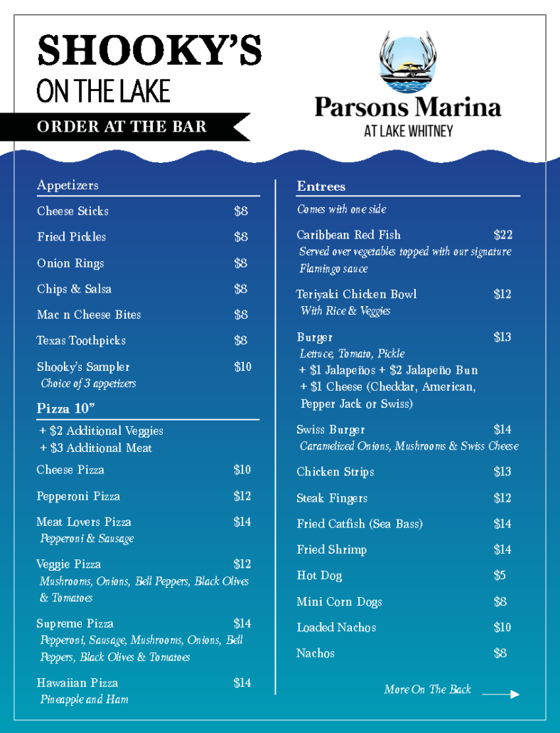 Nestled in the serene setting of Whitney, Texas, along the tranquil waters of Lake Whitney, Shooky's On The Lake invites you to embark on a delightful culinary adventure. Our menu is thoughtfully curated to offer a variety of flavors that cater to every palate. Begin your experience with our irresistible Italian Sandwich, perfectly paired with a side of sweet potato fries. For a true taste of the South, indulge in our crispy steak fingers or savor the classic flavors of our hearty club sandwich. Wing enthusiasts will find solace in our mouth-watering wings and fries combo, while pizza lovers can choose from our zesty pepperoni or fully-loaded meat pizza. Don't miss out on our standout smoked turkey, promising to deliver a smoky aroma and tender bite. Pair your meal with one of our mixed martinis for the perfect finishing touch. Join us at 285 Lofers Bend Park Rd and discover why Shooky's is the talk of the town!